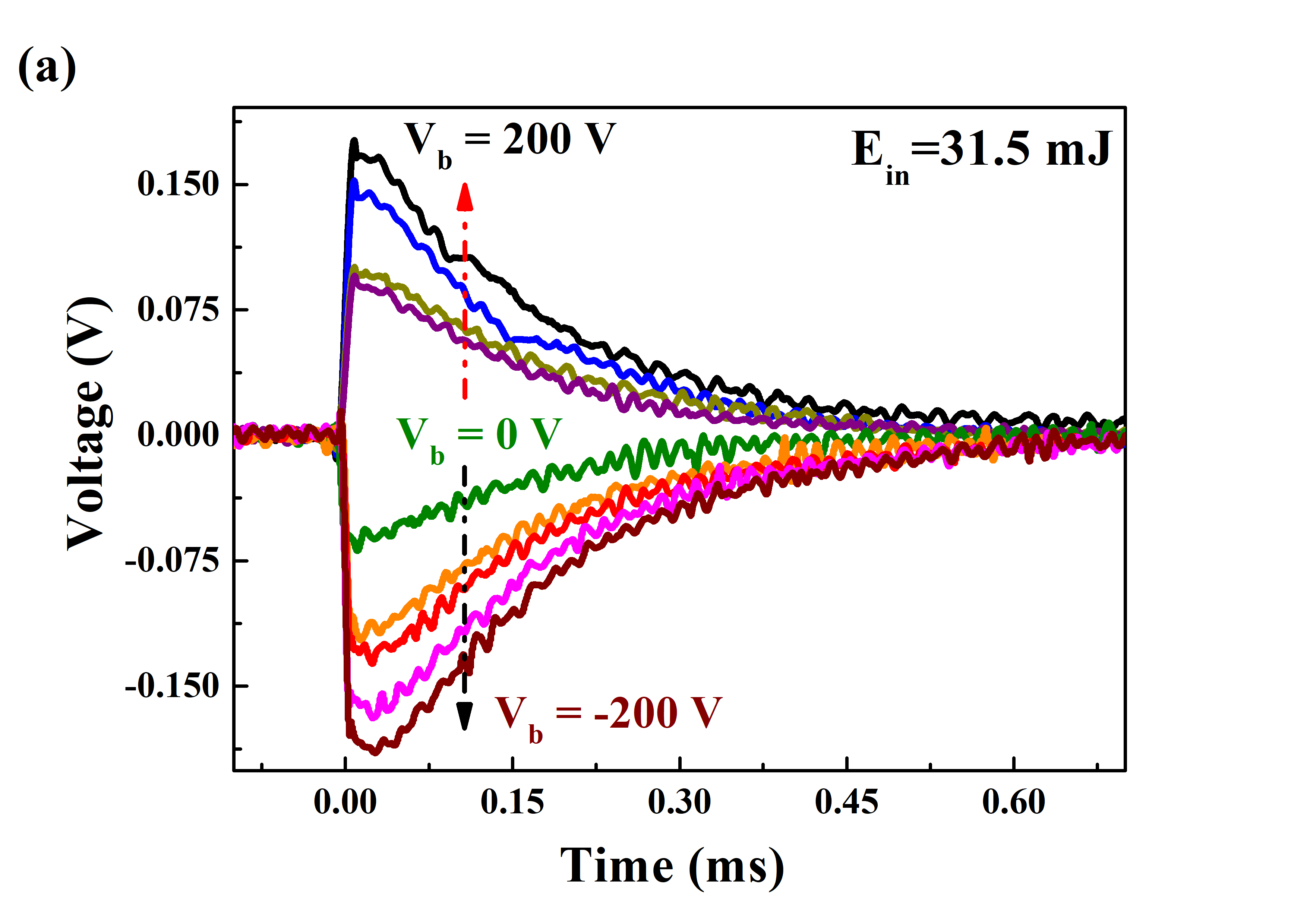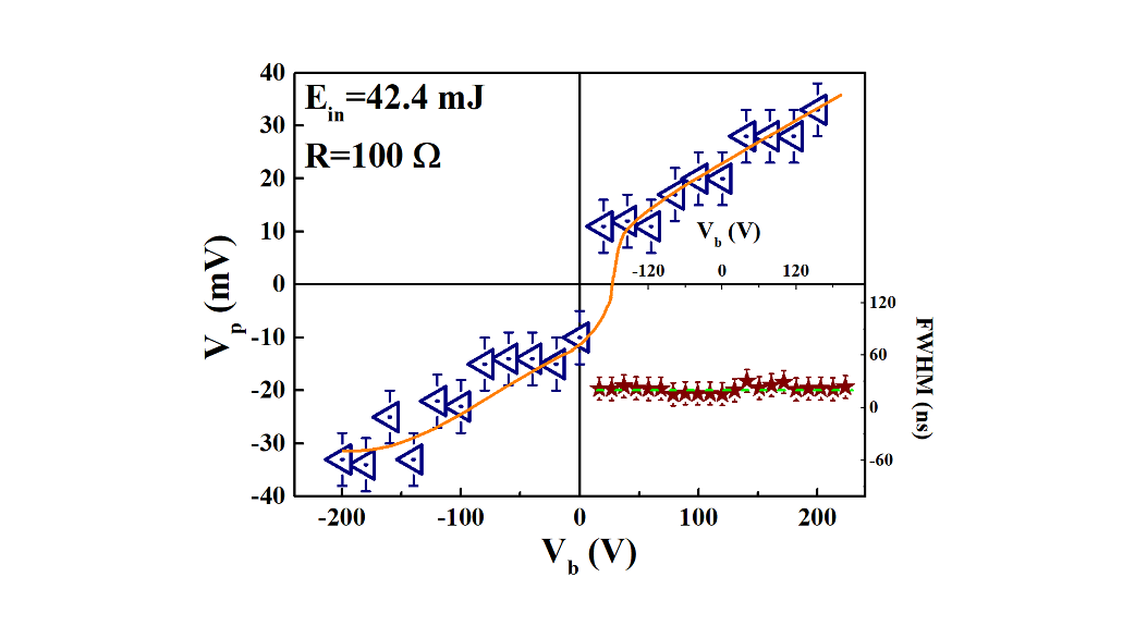 图1为激光辐照在样品上产生的LIV响应信号,随着偏置电压Vb和入射激光能量Ein的增加,信号的峰值(Vp)也会随着电极接收到等离子数目的增加而增大。