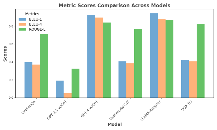 在ScienceQA数据集上的对比实验表明,VQA-TD以GPT-3.5的1%参数量,在答案准确率和解释文本生成质量上超过GPT-3.5;在部分任务上接近或超越Llama以及GPT-4。