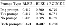 本文针对四种提示数据的输入情况进行了消融实验。实验结果表明,当同时输入两种提示类型数据时,模型输出的结果明显好于其它提示类型输入的情况(如表3所示)。