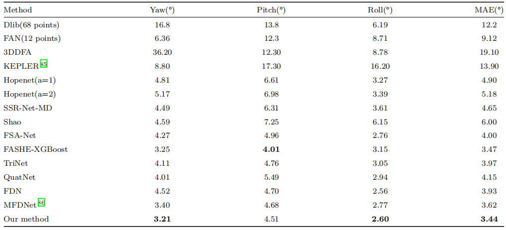 为了定量地评估我们的方法的准确性,表1和表2显示了最先进的方法和我们的方法与AFLW2000和BIWI数据集的MAE。粗体表示每一列中的最小值。结果表明,我们建立的关键点和头部姿态之间的非线性关系更稳健。在BIWI-train数据集上重新训练该模型,并在BIWI-test数据集上进行测试。实验结果见表3,表明所提模型的性能最优。可以看到,本文模型在所有数据集上都达到了最低的总体MAE,并且在单个数据集上也表现良好。