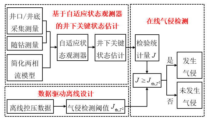 (2)设计了一种基于观测器匹配条件的自适应观测器,用于实时估计井下气侵工况的不确定参数(气藏产能指数及气体密度)与未知状态(气体体积),在此基础上结合霍特林的T2检验统计构建气侵检测方法。