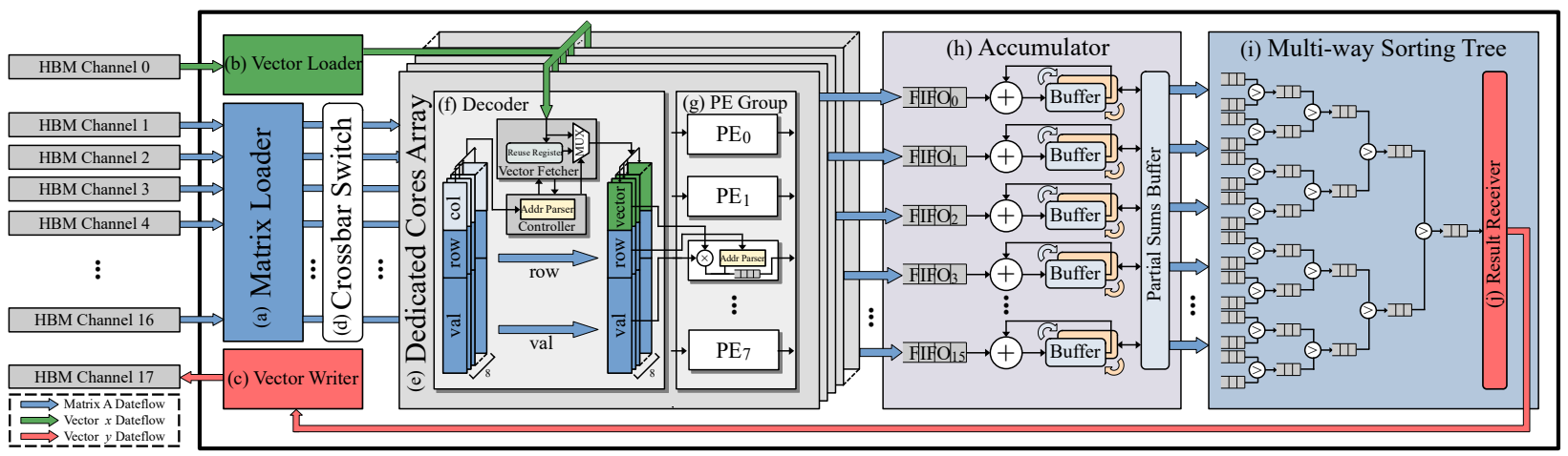 我们精心规划了HBM通道的分配方案,以充分利用内存带宽。以感知解码器为中心的硬件架构可以跳过稀疏矩阵中的空白结构,以减少冗余的向量片上内存写入。灵活的重用寄存器暂存可复用向量元素,以提高向量重用性。此外,我们还设置了Ping-Pong缓冲区,以掩盖不同批次之间的内存切换延迟。