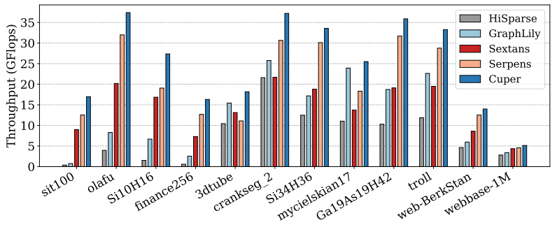 K80 GPU和Cuper的最大吞吐量分别为24.81 GFlops和46.74 GFlops。与K80 GPU相比,Cuper在2,757个SuiteSparse矩阵上的吞吐量和能效分别提高了2.51倍和7.97倍。