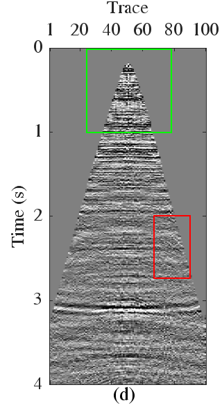 图7 (a)原数据。(b)-(d)分别是由常规PRT、高阶PRT和提出方法得到的多次波压制结果