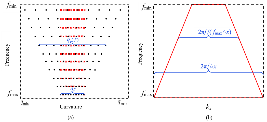 图1 (a)常规曲率采样和频变曲率采样;(b)波数带宽