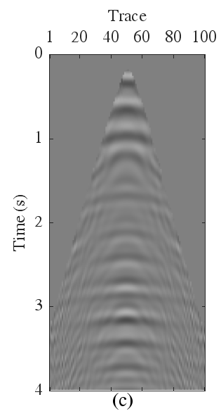 进一步将所有数据按照波到达时排序,如图7(a)所示,可见其中含有大量的多次波。经常规PRT多次波压制后,仍有多次波残差,如图7(b)所示。而高阶PRT和提出方法得到的一次波较干净,如图7(c)和(d)所示。表1为计算时间对比,显然,和具有保幅性的高阶PRT相比,本文方法用时更少。这说明,本文方法在多次波压制精度和效率方面都展现出了优势。