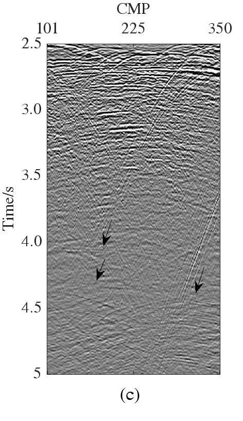进一步对叠加剖面进行分析。原始数据叠加剖面如图6a所示,在4.0 s和4.3 s附近可以看到明显的多次波。图6b和6c分别是高分辨率方法和本文提出方法压制多次波后的叠加剖面。在高分辨率方法中仍有明显的多次波残留,如黑色箭头所示,而本文方法的处理结果中几乎看不到多次波残留。这说明,本文方法有更好的多次波压制效果。此外,高分辨率方法用时1433.79 s;而本文方法仅用时371.15 s,大大降低了计算成本。