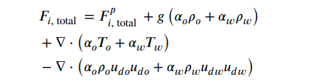其中,ρo−w和po−w分别为油水混合物的压力和密度,To和Tw分别为油和水黏性力张量,uo−w是混合物的速度,udo和udw分别为水相和油相的漂移速度。表面张力中粒子间的相互作用力方程为: