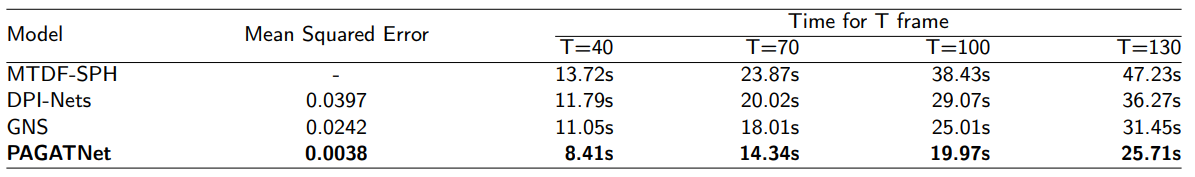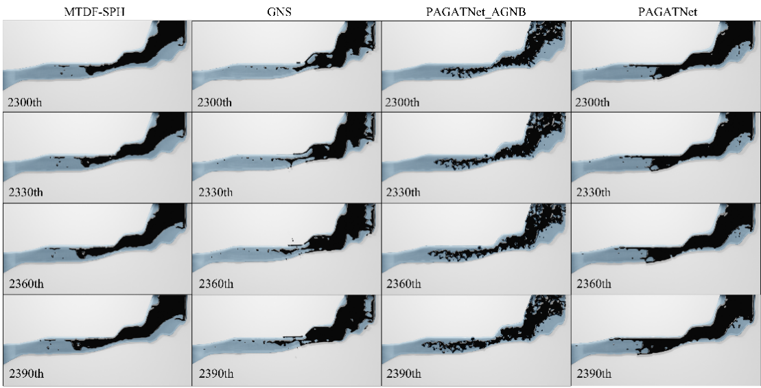 为了验证模拟算法的效率,我们比较了MTDF-SPH、DPI-Nets、GNS和PAGATNet在真实河流上模拟原油泄漏的情况。如表2所示,与其它算法相比,PAGATNet显著减少了整体计算时间。当模拟帧数为130时,PAGATNet所需的时间比MTDF-SPH少了45.57%。这表明,相较于其他算法,PAGATNet在模拟计算中具有更高的效率。