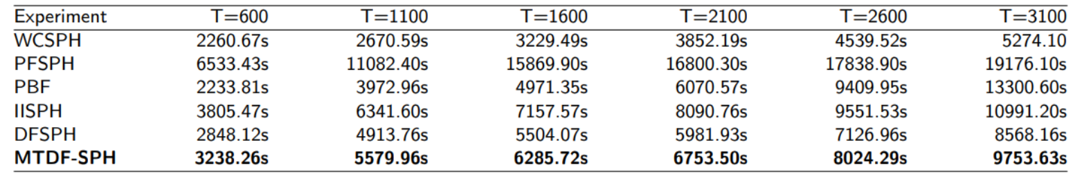 由于SPH算法中融入了混合模型和表面张力模型,导致油泄漏模拟的时间有所增加。如表1所示,在第3100帧时,MTDF-SPH所需的时间比DFSPH增加了13.84%。因此,需要优化MTDF-SPH算法以提高其模拟效率。