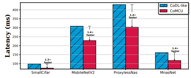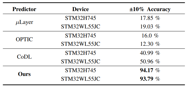 最后,我们评估了CoMCU的延迟预测模型的性能,如上图所示。由于该延迟预测模型考虑了MMCU的平台特性,因此能够实现93%以上的准确率。