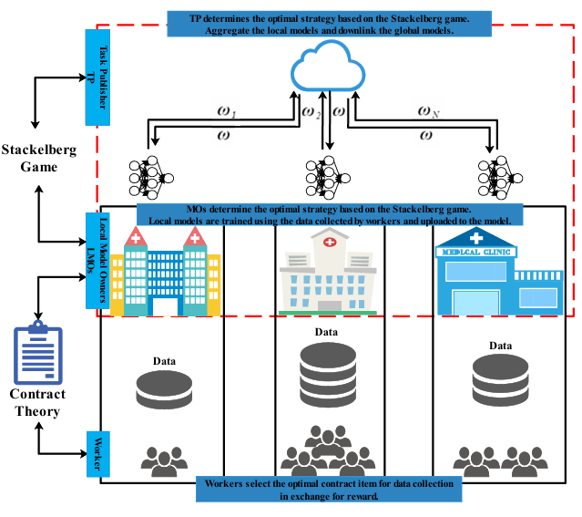 尽管联邦学习在协作学习和用户隐私保护方面显示出了巨大的优势,但如果边缘节点没有足够的训练资源,联邦学习的性能将会下降。因此,激励本地模型所有者参与联邦学习并确保他们拥有足够的数据至关重要。许多技术已被应用于设计激励机制,包括契约理论、Stackelberg博弈和拍卖等。然而,现有研究通常只关注任务发布者与本地模型所有者之间或本地模型所有者与工人之间的激励机制设计,未能充分考虑当本地模型所有者提供的数据不足以满足模型训练需求时的特征,以及工人在数据收集过程中的边际效用递减规律。为此,本文提出了一个基于分层博弈的三层框架,旨在分析任务发布者、本地模型所有者和工人之间的相互作用,设计有效的激励机制以激励工人收集数据和本地模型所有者参与联邦学习,并解决激励不匹配和信息不对称问题。