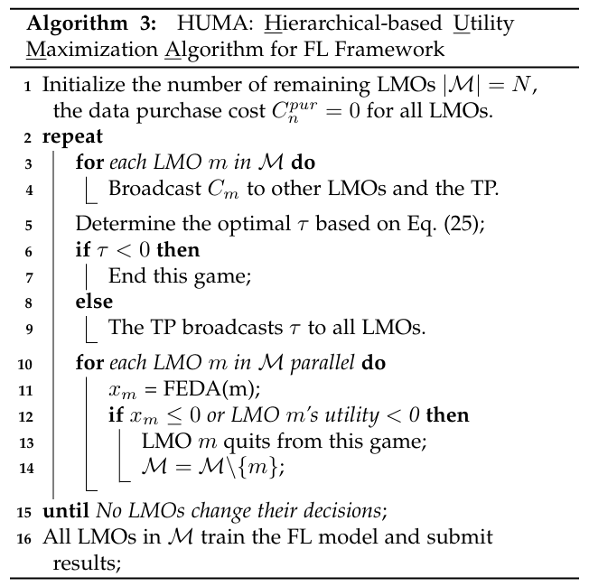 在本文中,我们提出了一种用于联邦学习的分层博弈框架,包括任务发布者、多个本地模型所有者和多种类型的工人。由于框架中的激励不匹配问题,作者将框架分解为两个子博弈。在上层博弈中,采用基于Stackelberg博弈的激励机制来激励本地模型所有者增加参与水平。在下层博弈中,应用契约理论解决本地模型所有者和工人之间的信息不对称问题。随后,开发了统一算法HUMA来解决层次游戏框架的效用最大化问题。在该框架中,本文捕获了当本地模型所有者提供的数据不满足模型训练要求时,任务发布者、本地模型所有者和工人之间的互动,并相应地设计了激励机制以激励他们加入联邦学习。最后,通过数值实验展示了所提出方案的有效性和优势。未来的工作中,我们将进一步考虑任务的动态到达和环境(如时变信道),研究适应性的层次激励机制框架。此外,还将考虑更复杂的隐私问题,并研究不同类型的工人在层次激励机制框架中与不同质量水平的训练样本相关联的问题。