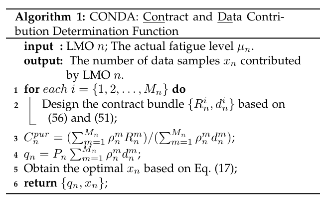 在上层博弈中,采用两阶段的Stackelberg博弈来模拟中心节点与边缘节点之间的动态互动。在博弈的第一阶段,中心节点公布总奖励。接着,在第二阶段,边缘节点根据公布的奖励决定自己的参与程度,以最大化个体效用,其中边缘节点策略体现为贡献的数据样本数量。鉴于每个边缘节点都追求自身效用的最大化,且行为自私且理性,边缘节点之间的互动可以转化为一个非合作博弈,其中的纳什均衡反映了各方的最优策略。在下层博弈中,由于边缘节点不知道数据拥有者的私有属性,数据拥有者会隐瞒它们的类型以获取更多的奖励。因此,可以应用契约理论来解决边缘节点和数据拥有者之间的信息不对称问题。在这一部分,本文提出了契约理论的可行条件,优化了其可行条件,并最终给出了最优契约的解析解。上层和下层的激励机制设计问题已经被分别解决。然而,由于上下层的耦合,不能直接进行求解,我们提出了基于分层的效用最大化算法来解决上述问题。