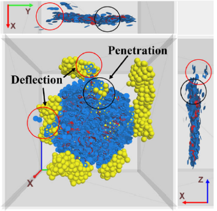 基于Voronoi网络结构的三维DEM砾岩数字模型与流固耦合压裂算法相结合能实现精准的裂缝扩展过程计算。图3为砾岩压裂模拟结果与实验结果对比图,两者均体现了穿砾及绕砾两种遇砾扩展模式。