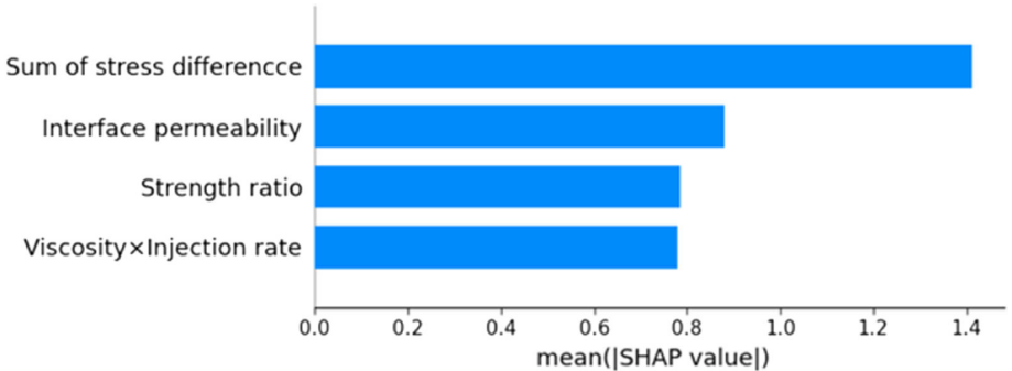 在XGBoost完成预测后,采用SHAP对预测结果进行解释。图4展示了训练集数据的SHAP值,其中Feature value表示相应特征的输入值,SHAP值为正的特征值有利于穿砾,而SHAP值为负的特征值有利于绕砾,可看出较高的界面渗透率和强度差会促进裂缝遇砾偏转,而较高的地应力差、粘度和排量会促进穿砾。