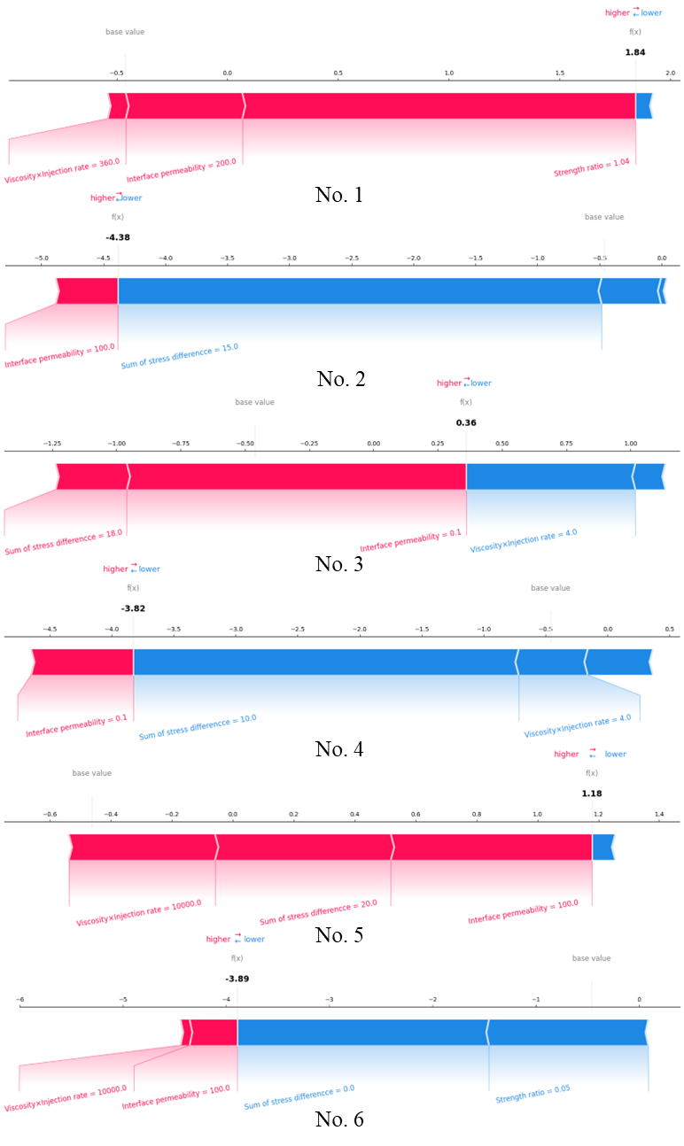 利用XGBoost-SHAP可解释机器学习框架,可实现对单独案例的裂缝形态预测及结果解释,并生成特征对抗图以辅助理解。本文从参考文献中选取了6组案例,并将相应特征值输入预训练的XGBoost生成预测结果,如表2所示,可看出XGBoost对6组案例均做出了正确预测。进一步地,利用SHAP对每个案例的预测结果进行解释并生成特征对抗图,如图6所示。图中f(x)为所有输入特征的累计贡献值,当f(x)高于基准值(base value)时,代表预测结果为穿砾,反之当f(x)低于基准值(base value)时,代表预测结果为绕砾。特征颜色为红色时表示其有利于穿砾,为蓝色时表示其有利于绕砾,且特征条长度体现其贡献程度。