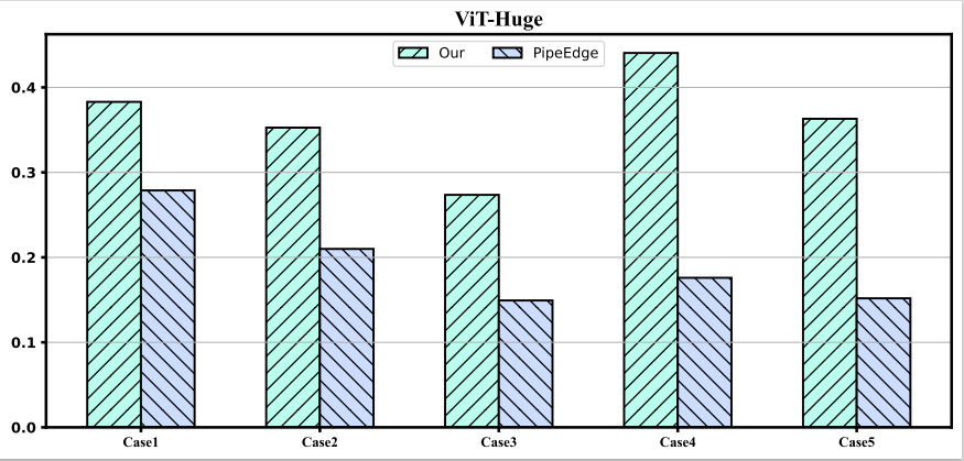 本文利用ViT-Large和ViT-Huge模型在五种异构配置下进行实验并和PipeEdge进行对比,实验结果如下:
