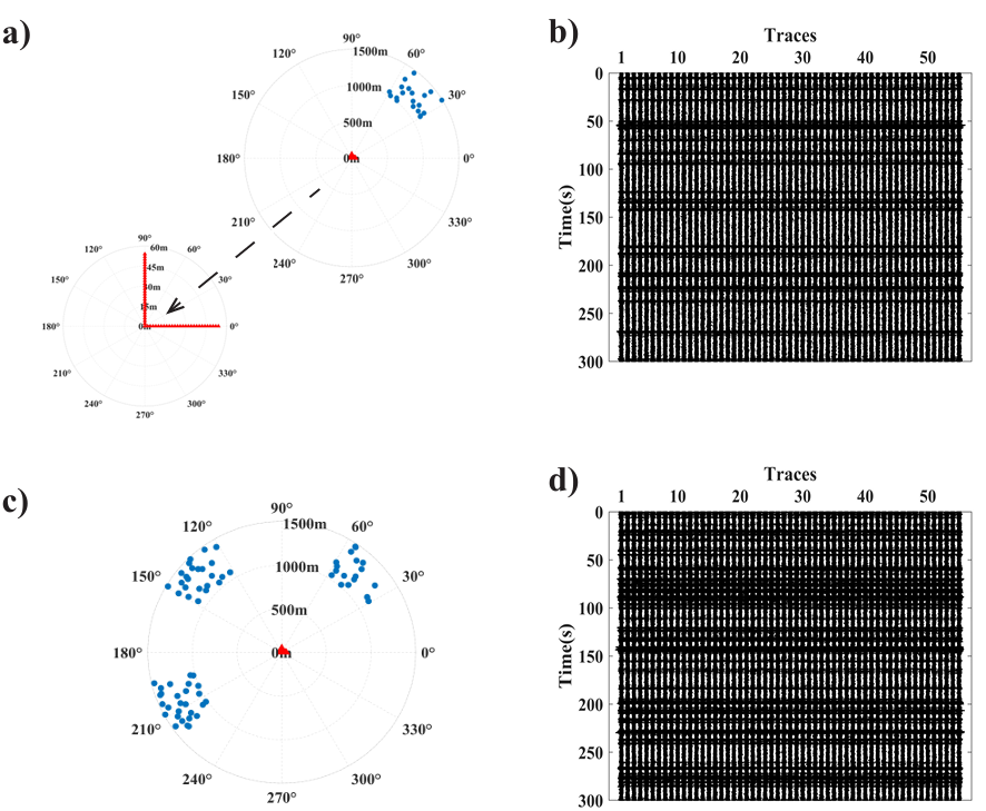 为了进一步证明本文方法的有效性,我们将其应用于实际数据,试验地点及观测系统如图6(a)和图6(b)所示。图7为检波器所接收到的地震记录。图8和图9为实际数据下采用常规波束形成、传统MUSIC及SV-MUSIC方法得到的频率-方位谱与频散谱。