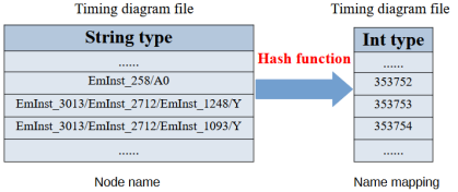 在STA中,逻辑门的名称通常以字符串的形式存储在电路文件中。对于大规模的电路,字符串的搜索和比较将消耗大量的内存和时间。我们提出了一种名称映射方法,将电路文件中一个逻辑门的所有名称映射为整数,并且在程序运行过程中只使用整数进行计算。这种方式,特别是在大规模电路中,节省了大量的内存,也在一定程度上减少了运行时间。图4显示了Hash函数的映射过程。