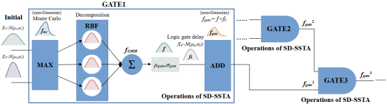 a. µ和σ: Max运算后通常形成非高斯分布。所以我们用高斯混合模型(Gaussian Mixture Model,GMM)建立模型最大值的概率密度函数(Probability Density Function,PDF)。首先利用蒙特卡罗模拟方法对非高斯分布进行建模,然后利用GMM进行拟合。换句话说,它可以分解成基本函数单元(Radial Basis Function,RBF)。进一步,我们从模型的属性中提取每个拟合RBF的µ和σ。因此,我们将非高斯分布作为公式(1)的线性组合来处理,如图3所示。最后,通过公式(2)提取到达时间µ和σ: