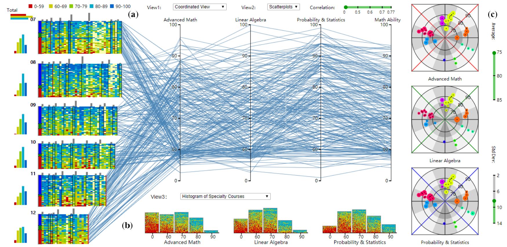 在整体层面,通过一组矩阵热力图从学生角度描述多个年级全部专业课程成绩分布,并与一组反映数学成绩的平行坐标视图联动,展示两类课程成绩整体分布和相关性;通过设计支持分层排序的像素柱状图整合了数学课程成绩和专业课程成绩的统计分布。