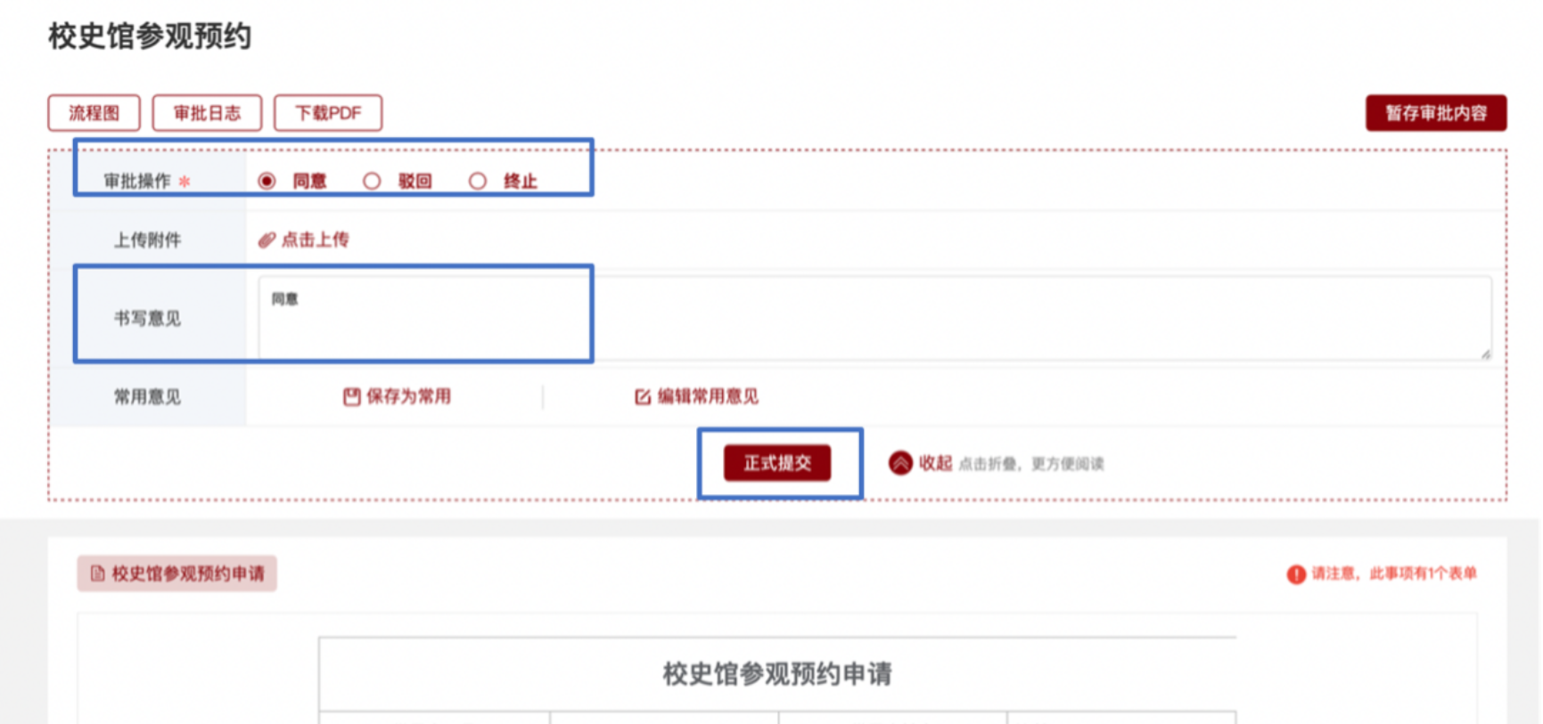 4.申请单位负责人填写审批意见,点击“正式提交”,流程转至档案馆负责人审批。