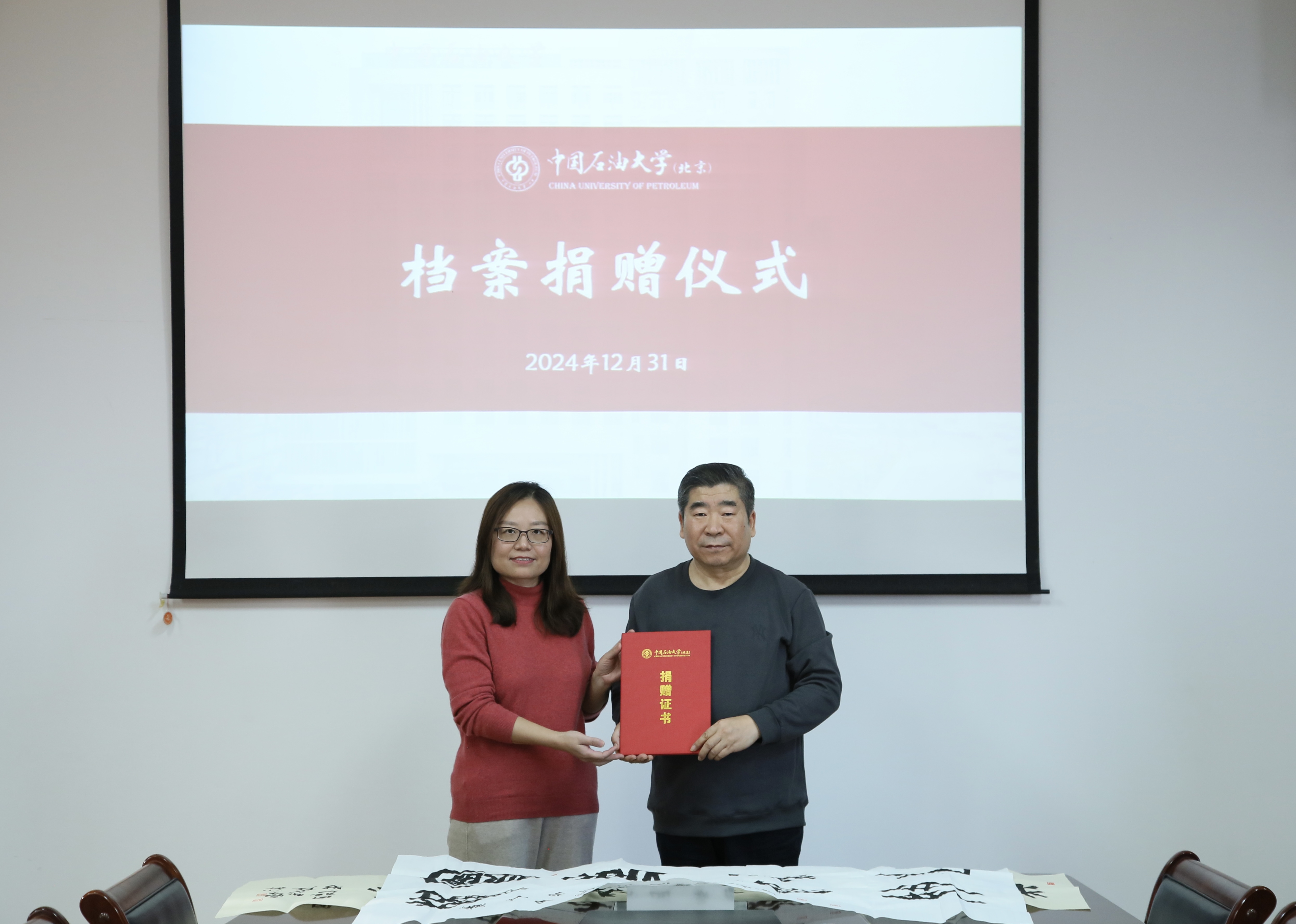 仪式上,柴柏增捐赠了由其书写的两幅金文大篆字体的书法作品《我为祖国献石油》(学校校歌名称)和《实事求是 艰苦奋斗》(学校校风)。海凤、宋刚代表图书馆(档案馆)接受捐赠,并为柴柏增颁发捐赠证书。