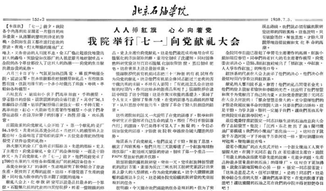 1958年“七一”前夕,北京石油学院各个角落都充满着节日的欢乐气氛。白天,全院师生员工忘我的工作,夜晚,大家披星戴月地赶制帅旗和各种模型。6月30日,师生们高举帅旗,手抬模型,穿着节日的盛装,载歌载舞地向会场行进,用精美的模型、精致的样品、最新科研成果等向党献礼。