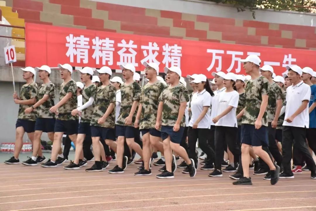 在克拉玛依校区的红旗操场上新生认真参加入学军训