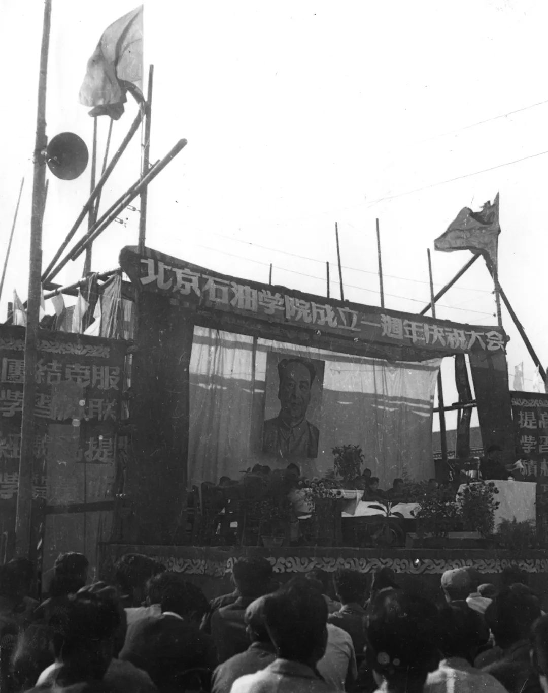 1954年9月26日是北京石油学院成立一周年的校庆,为了迎接这一天,全院师生提前做了很多准备工作。学院举办图片展介绍这一年的教学成就和同学们学习生活的情况。当日下午大家以兴奋的心情参加庆祝大会,在得到中央燃料工业部及石油总局领导对学院一年来成绩的祝贺后,师生、员工们备受鼓舞,充满信心以更大的努力完成新学年的任务。