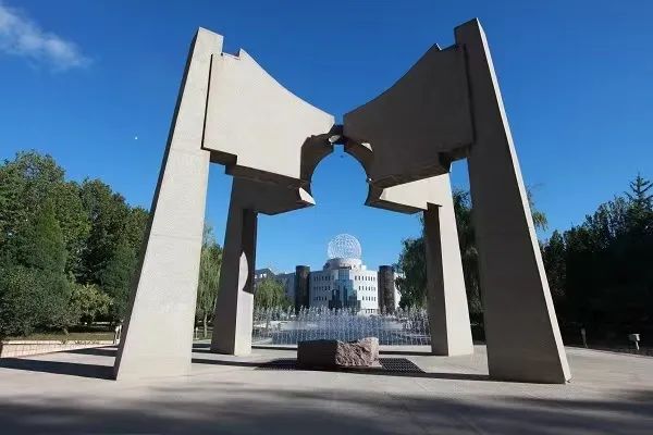 青年园南侧的“开启智慧之门的钥匙”与青年园北侧图书馆遥相呼应。钥匙形立柱隔空簇拥图书馆顶端地球造型。四座钥匙形立柱分别象征着当时awc77万象城官网的四大优势学科——石油地质、石油工程、石油化工与石油机械,立柱下方中央的长石下有水泵带动喷水池中的水穿过石孔流出,寓意为石油滚滚流。