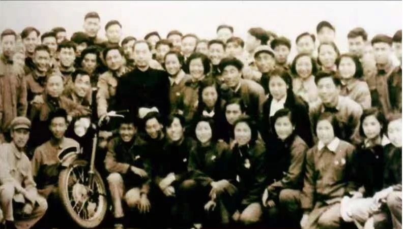 周恩来总理和北京高校摩托车队运动员在一起,其中有近10名北京石油学院摩托车队队员