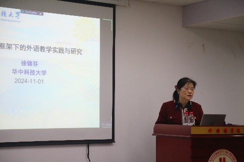 11月1日,华中科技大学徐锦芬教授受邀以“超学科框架下外语教学实践与研究”为题作了外语教学与研究工作系列坊讲座第四讲,外国语学院公共英语教学部主任梅丽主持讲座,学院师生代表参加讲座。