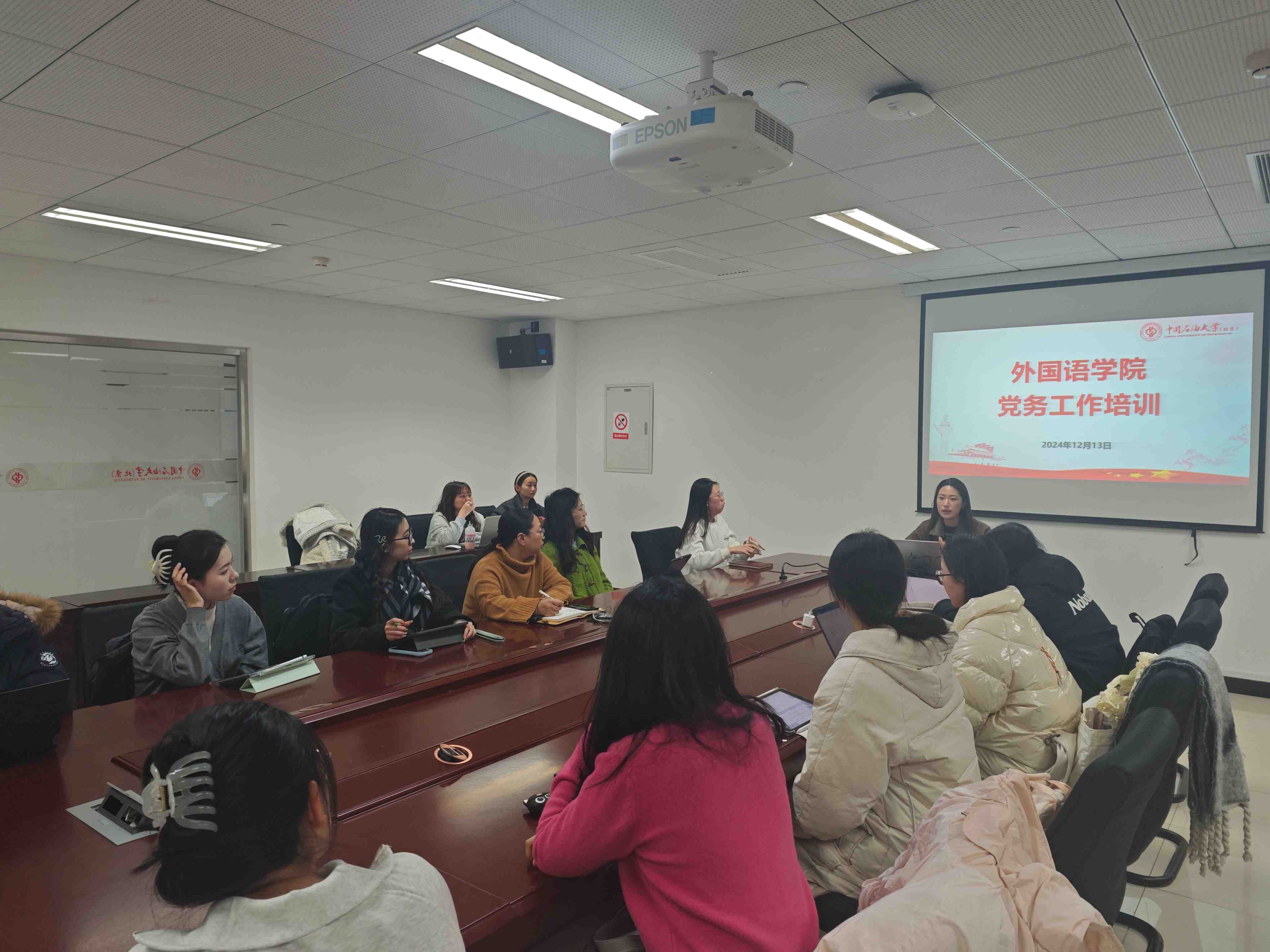 12月13日,外国语学院开展党务工作培训,学院党委副书记刘春阳及辅导员王芃月、姜珊出席会议,全体学生党支部书记、支委参加会议,此次培训由学院党务秘书安思睿主讲。