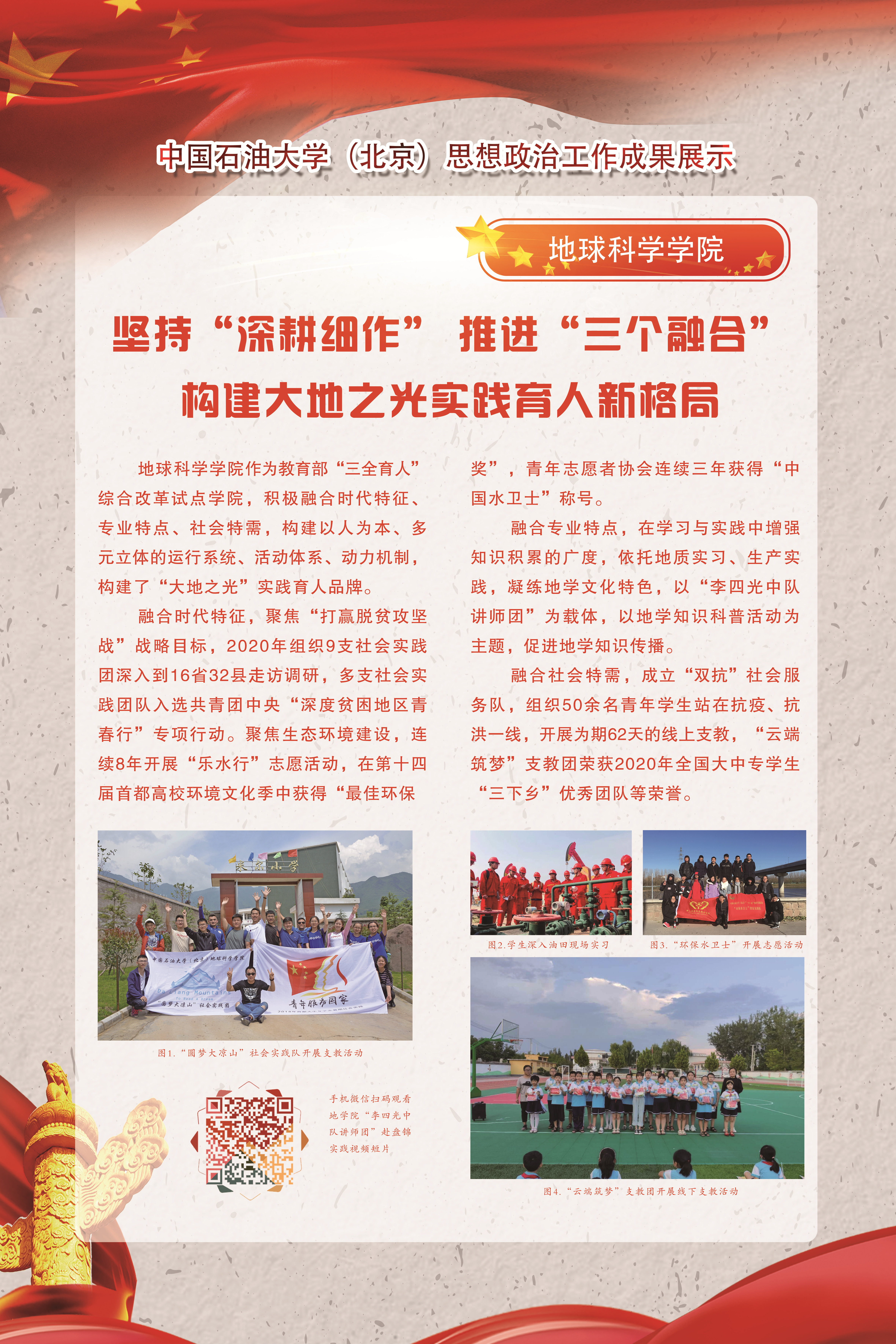 学院积极探索思想政治工作新模式,开辟思想政治工作新阵地。作为教育部“三全育人”综合改革试点学院,积极融合时代特征、专业特点、社会特需,构建以人为本、多元立体的运行系统、活动体系、动力机制,构建“大地之光”实践育人品牌。融合时代特征,聚焦“打赢脱贫攻坚战”战略目标,2020年组织9支社会实践团深入到16省32县走访调研,多支社会实践团队入选共青团中央“深度贫困地区青春行”专项行动。聚焦生态环境建设,连续8年开展“乐水行”志愿活动,在第十四届首都高校环境文化季中获得“最佳环保奖”,青年志愿者协会连续三年获得“中国水卫士”称号;融合专业特点,在学习与实践中增强知识积累的广度,依托地质实习、生产时间,凝炼地学文化特色,以“李四光中队讲师团”为载体,以地学知识科普活动为主题,促进地学知识传播;融合社会特需,成立“双抗”社会服务队,组织50余名青年学生站在抗疫、抗洪一线,开展为期62天的线上支教,“云端筑梦”支教团荣获2020年全国大中专学生“三下乡”优秀团队等荣誉。