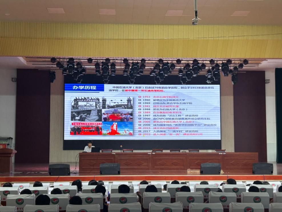 随后,实践团成员在学术报告厅开展招生宣传,为商水一高的莘莘学子介绍中石大的校园文化以及近年来在河南省的录取情况和招生政策,并解答现场学生的咨询问题。