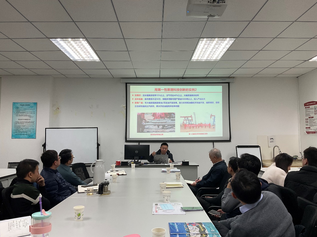 在座师生与熊伟就创新理论和方法进行了深入的互动讨论。针对岩石渗流力学在非常规油气领域勘探开发中的运用、第一性原理如何解决油气成藏等勘探问题,熊伟结合物理学理论和力学基础耐心地进行了解答。熊伟提出期许,希望“第一性原理”创新研究思路和方法在未来科研工作中广泛使用。