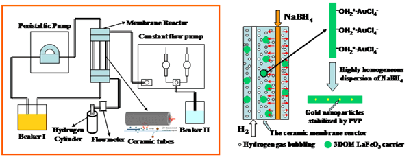 发展了一种制备担载贵金属催化剂的新方法––在“超声膜扩散法”的基础上,发明了“气膜还原法”。利用该方法制备出的复合氧化物担载金催化剂具有三维有序大孔结构,且Au纳米粒子的粒径可控,见图4。