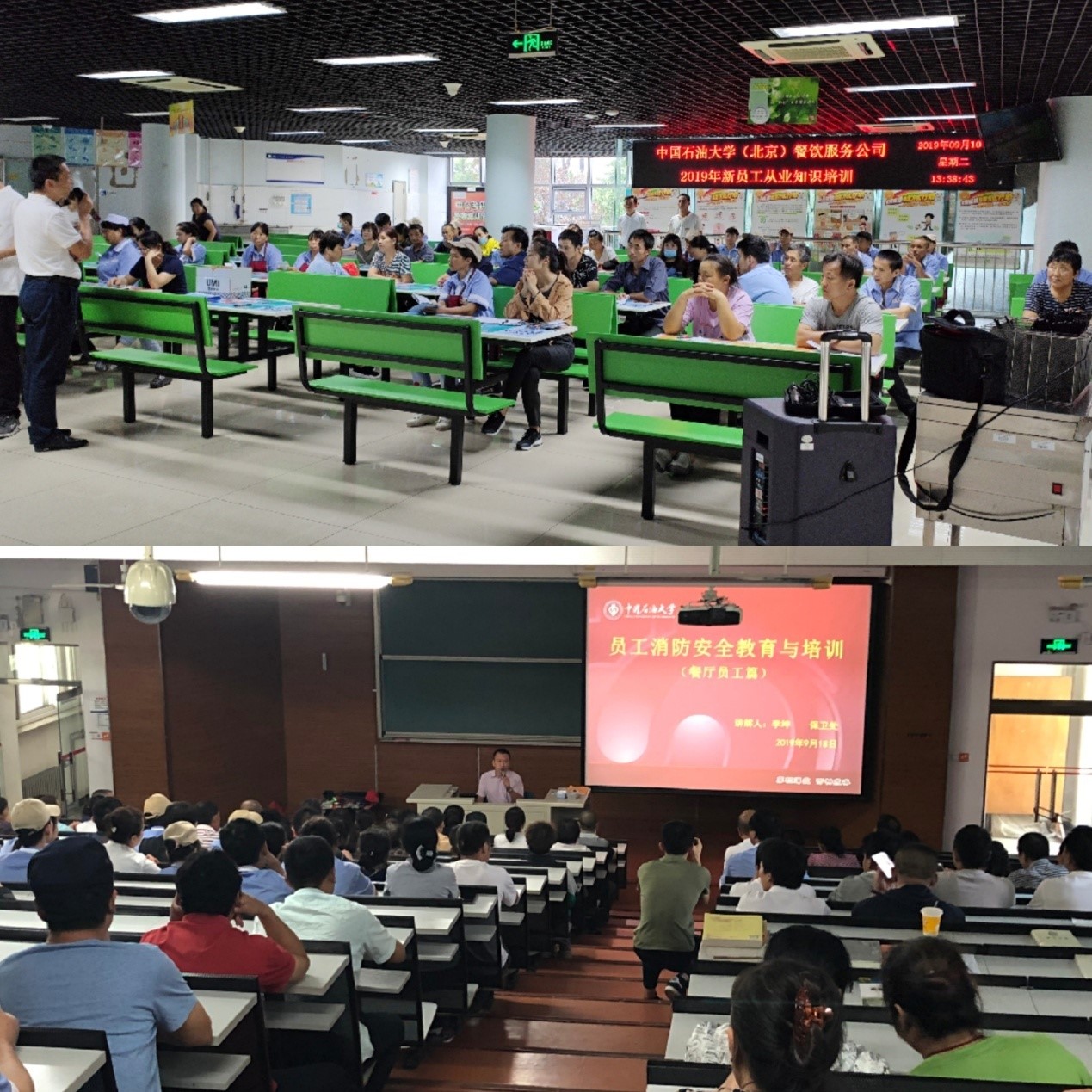 为营造校园饮食安全氛围,为师生提供更加安心的就餐环境和优质的餐饮服务,同时为增强食堂员工消防安全意识、提高消防技能, 9月10日、9月18日餐饮服务公司分别开展了“2019年新员工从业知识培训”和“员工消防安全教育与培训”。