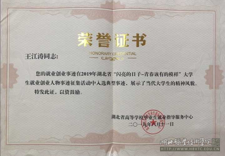 2019年4月,王江涛入选湖北省“闪亮的日子——青春该有的模样”大学生就业创业人物事迹。