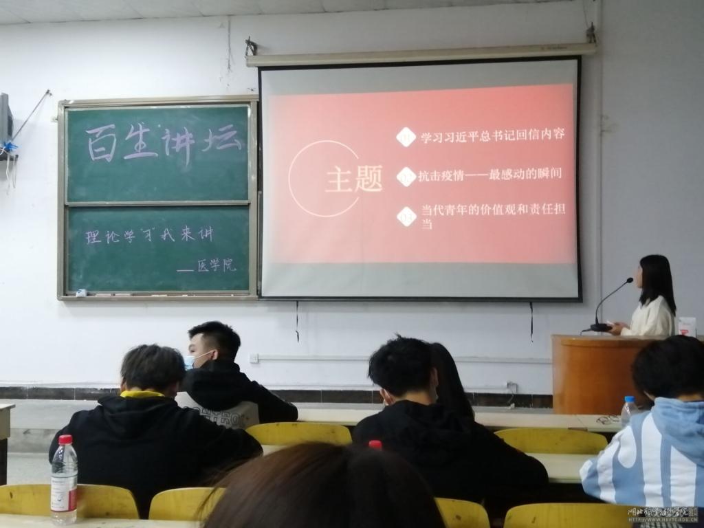 “百生讲坛”旨在用习近平新时代中国特色社会主义思想武装头脑、教育青年学生,把深入学习宣传贯彻党的十九大精神作为首要政治任务和核心工作,以“四进”为手段、以“四信”为目标,通过“进支部、进社团、进网络、进团课”,灵活创新形式方法,引导帮助青年学生和团学干部树立对党的科学理论的信仰,坚定跟党走中国特色社会主义道路实现中国梦的信念。2020年,kaiyun云开登录入口各团支部在校团委和团总支的指导下开展了一系列主题团日活动,立足专业特色,深入学习习总书记关于青年工作的重要思想。结合学习生活实际,举办了各具特色的主题活动,涌现出一批优秀的理论学习达人,他们代表了医学生最响亮的声音、最激昂的青春。