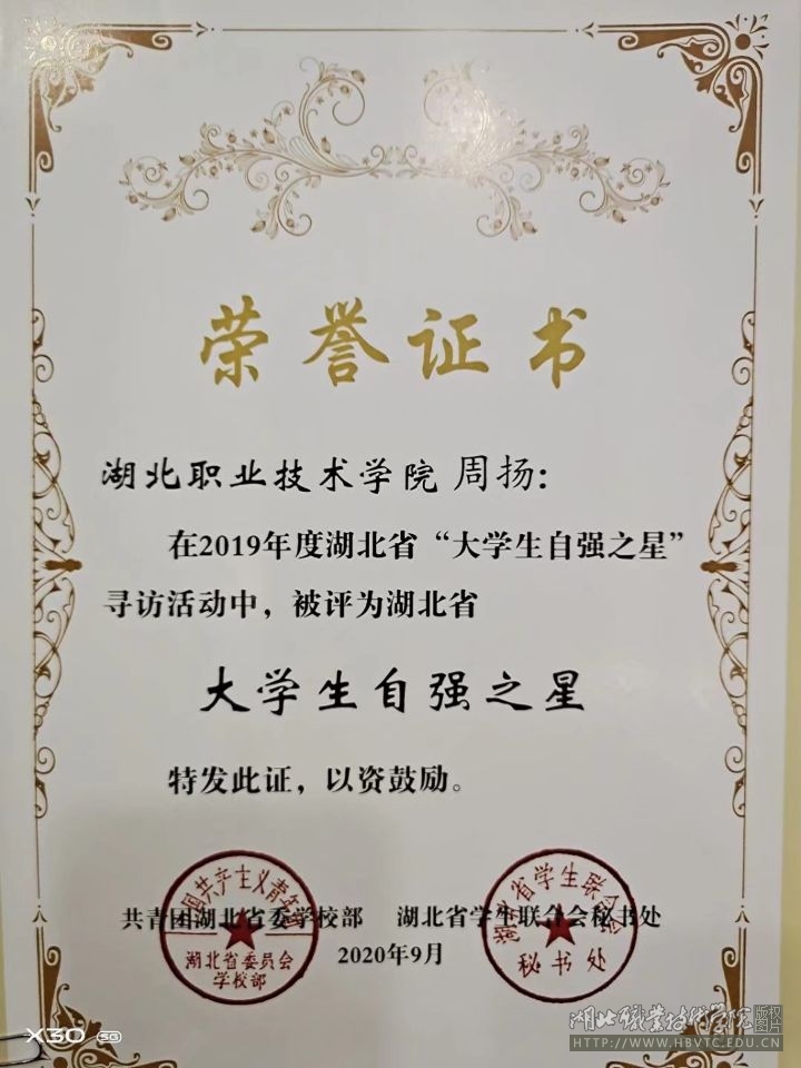为深入学习贯彻习近平新时代中国特色社会主义思想,在我省大学生中树立一批可亲、可敬、可信、可学的榜样,进一步培育和践行社会主义核心价值观,今年7月至8月,团省委、省学联组织开展了2019年度湖北省“大学生自强之星”评选活动。经学院推荐、学校申报、省级遴选等环节,kaiyun云开登录入口周扬同学被评为湖北省“大学生自强之星”。