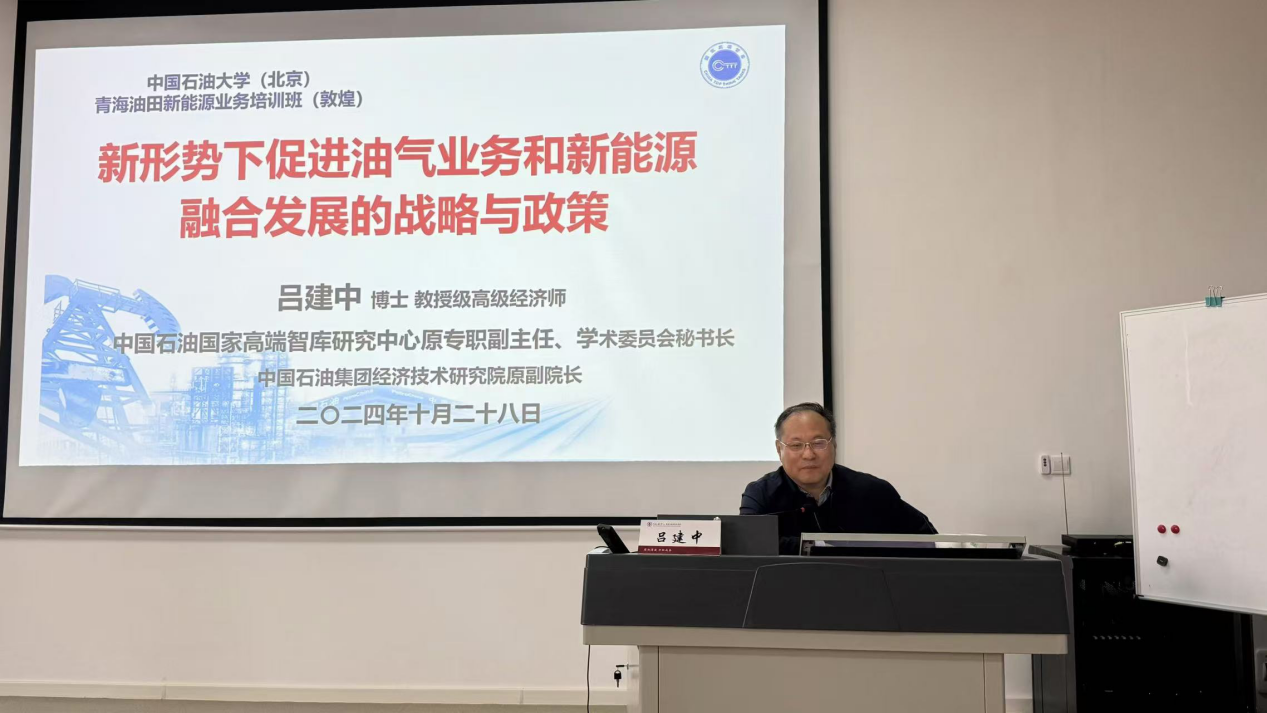 我院特别邀请了原中国石油经济技术研究院副院长吕建中担任首堂课程《新形势下促进油气业务和新能源融合发展的战略与政策》的主讲。为了使课程更具针对性,10月27日吕院长与青海油田新能源事业部的同事进行了深入交流,详细了解了青海油田新能源业务的发展现状和面临的挑战。10月28日,吕院长以一天的时间从宏观层面阐述了能源转型与新能源发展形势,并分析了油田在新能源发展中的政策与策略,指明了未来的发展方向,正式为本期培训拉开序幕。