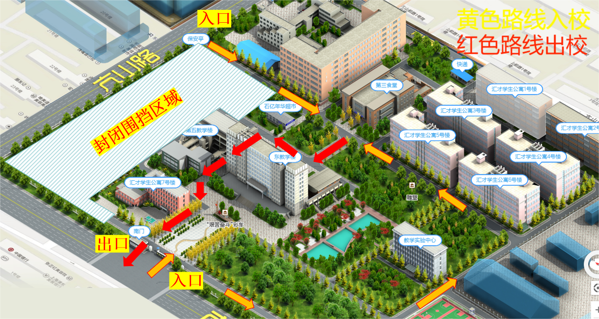 2.行车路线:东校园原有的机动车进校路线保持不变,出校路线临时调整为汇才学生公寓7号楼东侧小道(如图所示)。