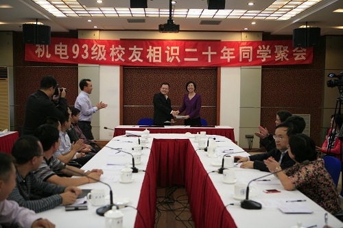 2013年10月迎来了母校60周年校庆,也是机电93级入校相识20年,想起当年同学入学时正赶上学校校庆40周年的纪念活动,那情景还历历在目。97年毕业后大部分同学各奔东西为成家立业劳苦奔波,也久未谋面,班长及几位在校的同学商议,在学校校庆60周年之际,同学们回到母校组织同学相识20周年聚会。倡议得到了同学们的积极响应,如何报答母校培养之恩也列入此次聚会的一项主要议题。之初班长蔡战胜同学的想法是由他为主出资买个礼品,代表机电93同学敬赠母校60周年校庆作为纪念,为此与学校校友会负责同志进行了交流沟通,提出捐款设立基金的建议。班长蔡战胜与几位同学商议,大家的意见是设立基金可行。于是向全国各地的同学们发出聚会的邀请时,也发出了捐款设立基金的倡议。同学们积极响应,几千、一万、数万从同学的银行卡汇入一起,汇成了21万元的机电93励志基金。