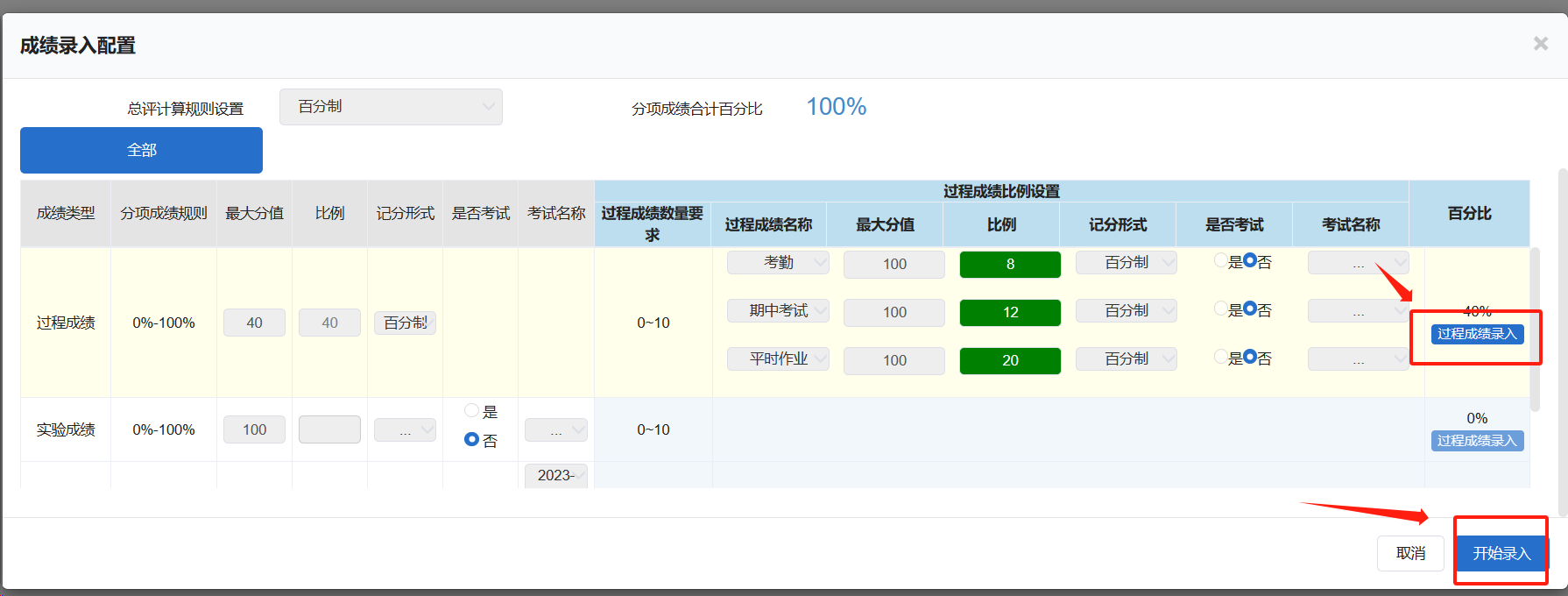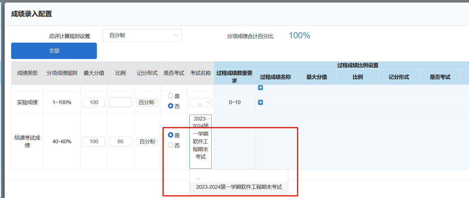 例:过程成绩占比40%,比例录入“40”后,过程成绩的最大分值会计算为“40”。