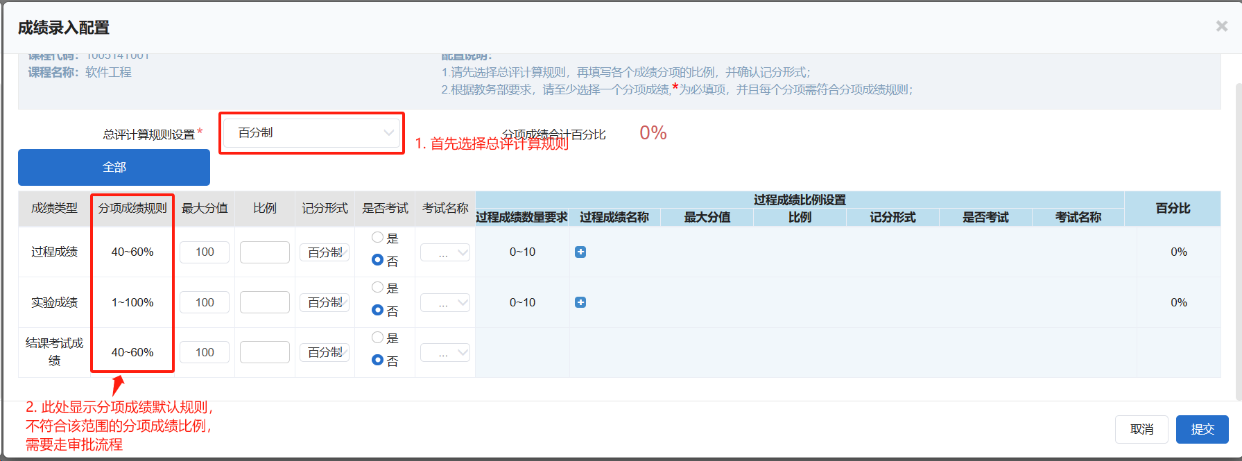(1)填写总评计算规则,下方第二列显示的是分项成绩占比的默认规则,过程成绩和结课考试成绩不符合分项占比规则的配置,需要进行审批。