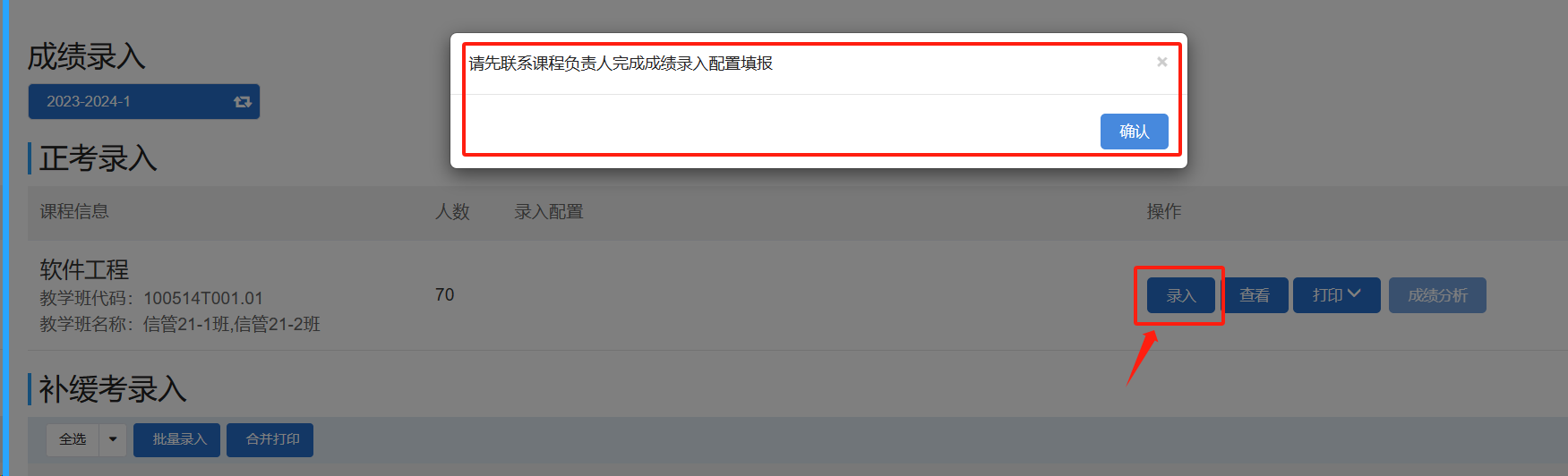 按钮进入到成绩录入页面。若课程负责人未填报成绩录入配置,系统会给出如下提示:请先联系课程负责人完成成绩录入配置填报。