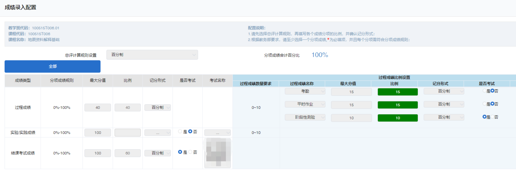 注:若无对应分项,比例空着即可,不要填写0;填写分项比例后才能添加后面的过程成绩。
